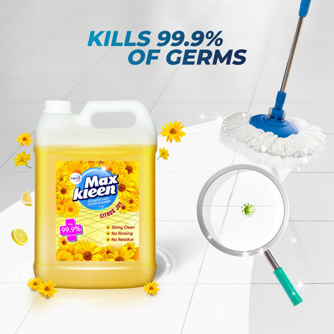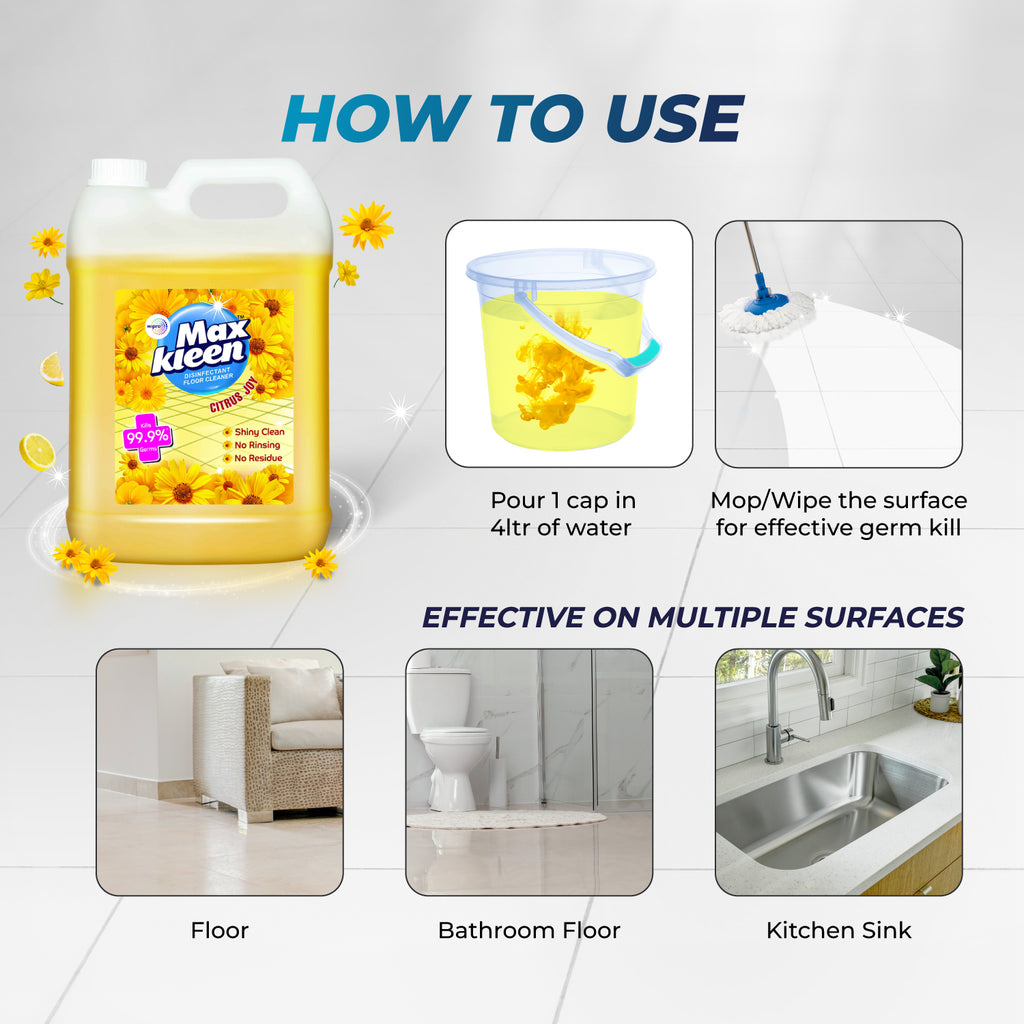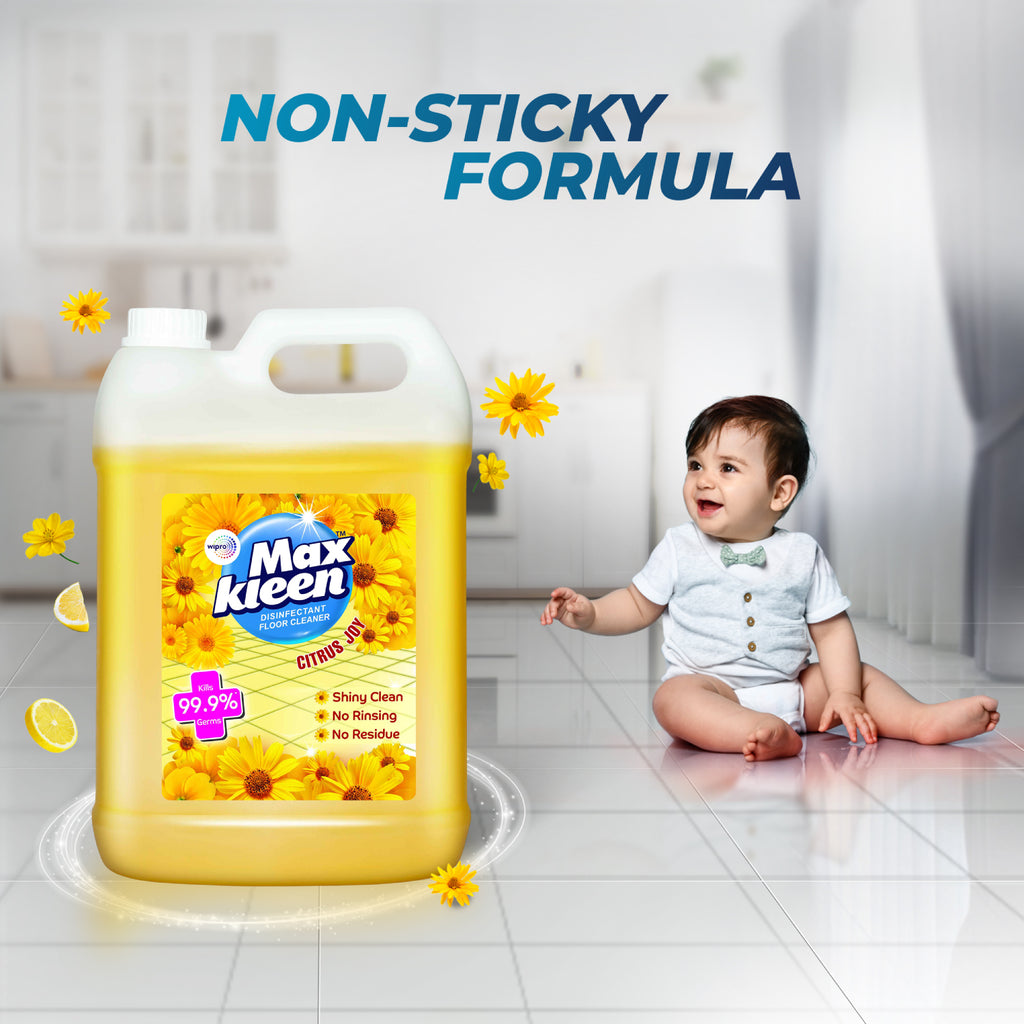 Product Story Step into a world of pristine floors and unparalleled hygiene with Maxkleen Disinfectant Floor Cleaner! With 99.9% germ protection, it guards your home against harmful bacteria and viruses. Rest assured, your loved ones are safe in a germ-free environment. Safe around kids and pets, it lets your children explore and play freely while your furry companions enjoy their spots worry-free!Maxkleen floor cleaning liquid provides a germ-free and insect-free environment for your floors. Its deep clean technology ensures that your floors are thoroughly cleaned and free from any sticky residue, leaving them shiny and pristine. This disinfectant floor cleaner also leaves a refreshing fragrance that transforms your living spaces into a pleasant oasis of freshness during and after cleaning. Specifications 99.9% GERM PROTECTION: Maxkleen Citrus Joy Disinfectant Floor Cleaner for 99.9% germ protection, ensuring a safe and hygienic home environment for your family. DEEP CLEAN TECHNOLOGY: Our product harnesses cutting-edge deep clean technology to penetrate and lift even the toughest dirt and grime from your surfaces. FRESH & PLEASANT FRAGRANCE: Indulge in the long-lasting scent of Citrus, filling your homes & offices with a refreshing fragrance SHINY CLEAN FLOORS: Maxkleen has a powerful formula that ensures your floors are left spotlessly clean and shiny, adding a touch of elegance to your home. NON-STICKY FORMULATION: Maxkleen has a gentle, residue-free formulation that leaves your floors clean and shiny without any sticky or tacky residue. Ingredients Benzalkonium Chloride Solution IP 4.00% w/v, Aqua, Lauryl Alcohol Ethoxylate, Cocamidopropyl Betaine, Sodium Bicarbonate, Perfume, Tetrasodium EDTA. How To Use Use one cap of Maxkleen floor cleaner in half a bucket of water and mix.Gently mop the surface. No need to rise. Benefits 99.9% GERM PROTECTION: Maxkleen Citrus Joy Disinfectant Floor Cleaner for 99.9% germ protection, ensuring a safe and hygienic home environment for your family. DEEP CLEAN TECHNOLOGY: Our product harnesses cutting-edge deep clean technology to penetrate and lift even the toughest dirt and grime from your surfaces. FRESH & PLEASANT FRAGRANCE: Indulge in the long-lasting scent of Citrus, filling your homes & offices with a refreshing fragrance SHINY CLEAN FLOORS: Maxkleen has a powerful formula that ensures your floors are left spotlessly clean and shiny, adding a touch of elegance to your home. NON-STICKY FORMULATION: Maxkleen has a gentle, residue-free formulation that leaves your floors clean and shiny without any sticky or tacky residue. |